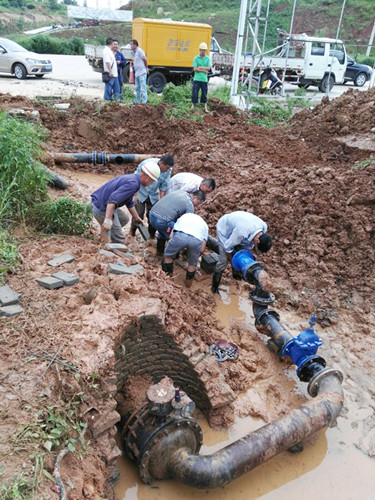 水務(wù)集團(tuán)按照城投公司“全力保障受災(zāi)群眾生活”的部署要求,選派干部帶隊(duì),抽調(diào)骨干立即趕赴現(xiàn)場,經(jīng)勘查后迅速確定啟用開發(fā)區(qū)新裝的DN400管道。施工人員克服暴雨如注、深夜施工等困難,經(jīng)過10多個小時的連續(xù)奮戰(zhàn),至7月3日18時,管道沖洗后水質(zhì)經(jīng)檢驗(yàn)合格,于晚上21時正式通水,保證了周邊企業(yè)和村民的生產(chǎn)生活用水,受到了當(dāng)?shù)卣途用袢罕姷馁潛P(yáng)。