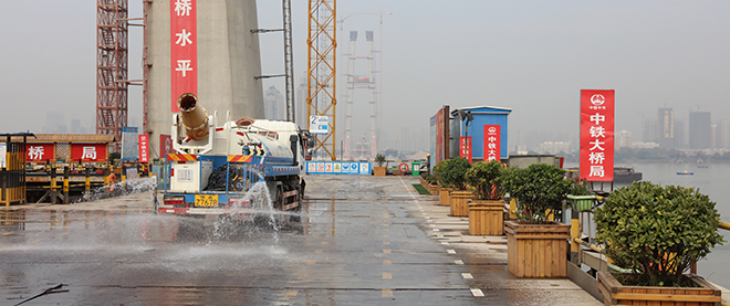 工程代建單位道橋公司有關(guān)負責(zé)人介紹:“我們這個工地的特點就是綠色環(huán)保,對揚塵嚴(yán)格控制,通過營造景觀、種植樹木提高工地的‘顏值’,讓工地變成花園。”在武昌岸的施工現(xiàn)場,花草樹木都被搬上了臨時搭建的鋼棧橋。為了提高花草樹木成活率,特別選用了成活率高的黃楊球、鐵樹等,并按照季節(jié)更換花草,還安裝了自動灌溉系統(tǒng)。