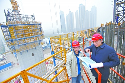 楊泗港長江大橋項目部負責人魯有月(右)在漢陽主塔墩指揮施工 記者陳卓 攝